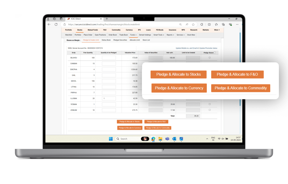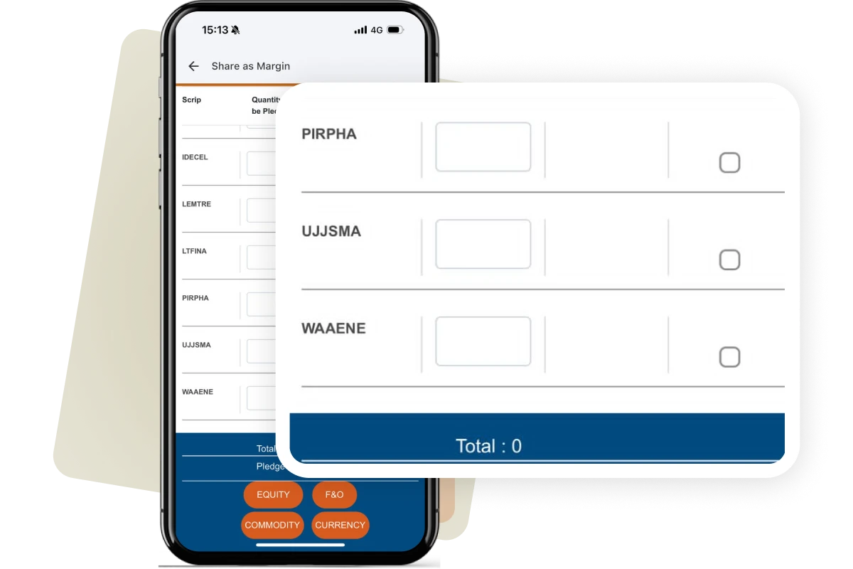Shares As Margin (SAM) lets you pledge existing shares held in your Demat Holdings to create instant trading limits. These limits can be used to trade in Intraday, MTF, Commodities (only selling/writing) and other leveraged products.