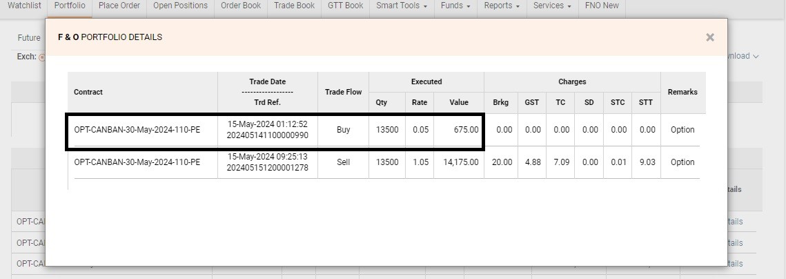 For Example - 550-PE, 540-PE, 520-PE strikes is valued at 110-PE, 108-PE, 104-PE respectively as shown above in portfolio details.