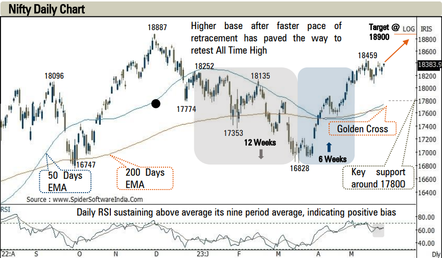 • In the current scenario, after four month’s decline the index resolved higher over past two months and now just shying away 2.5% from its all-time high. Hence, dips should be used as incremental buying opportunity to ride next leg of up move towards 18,900 in coming months as it is confluence of: