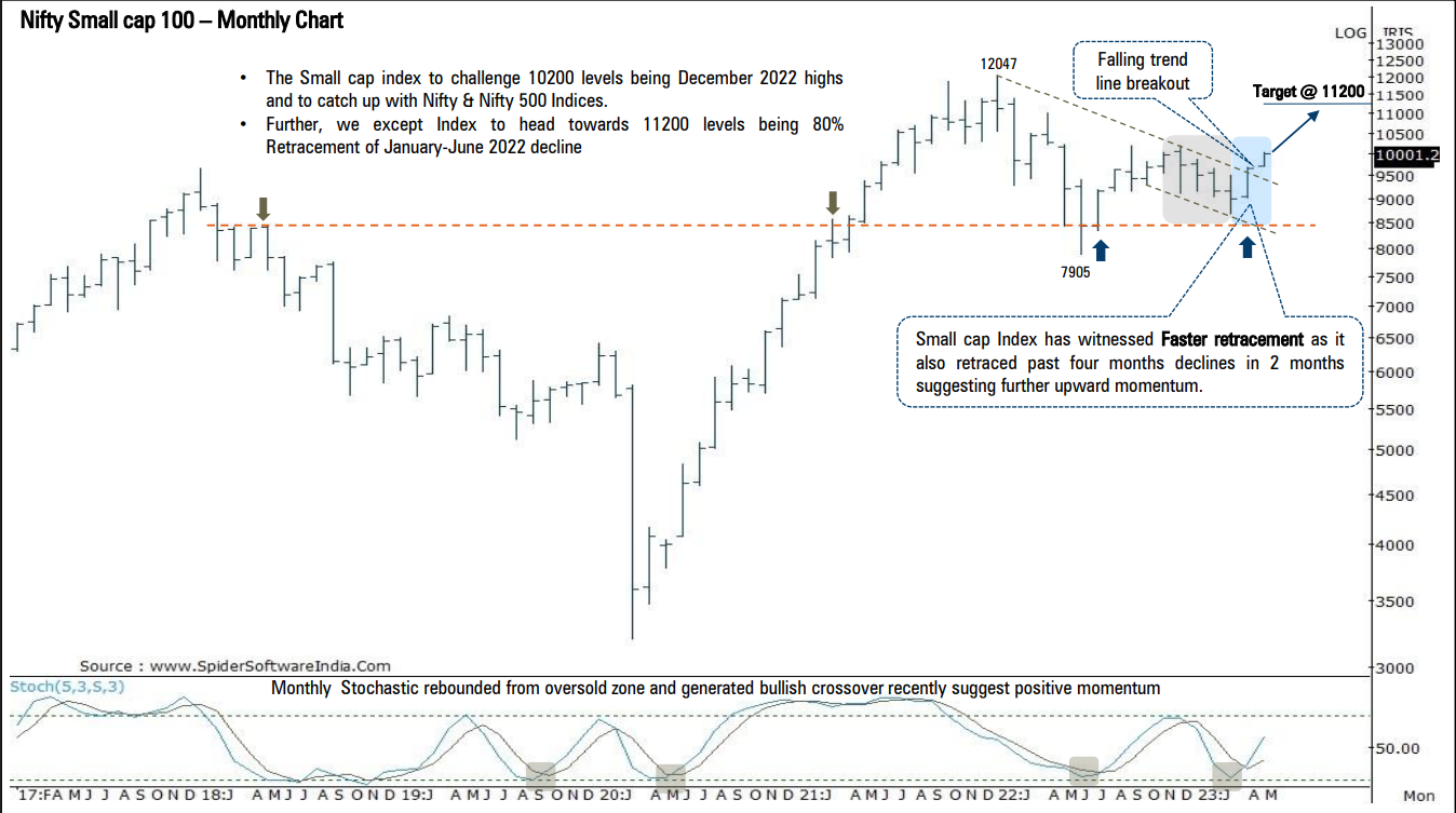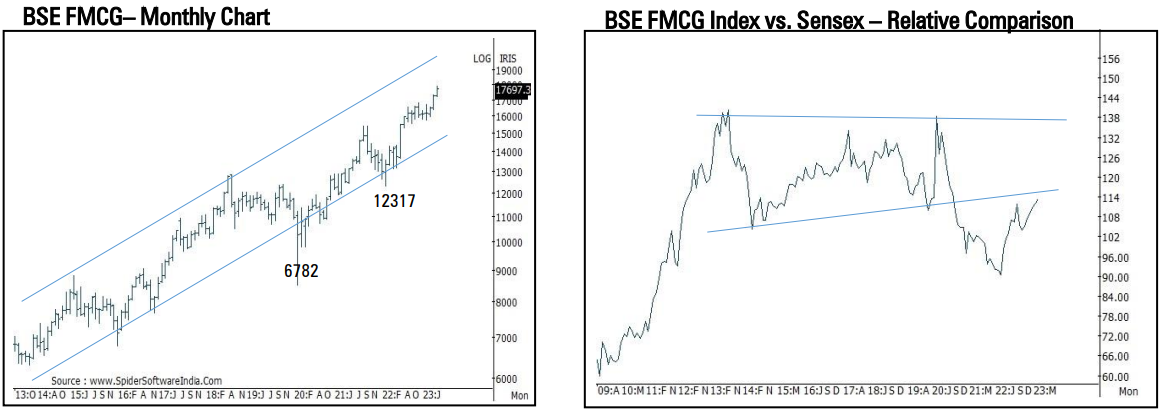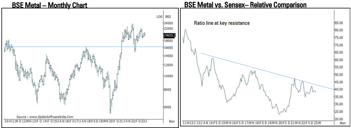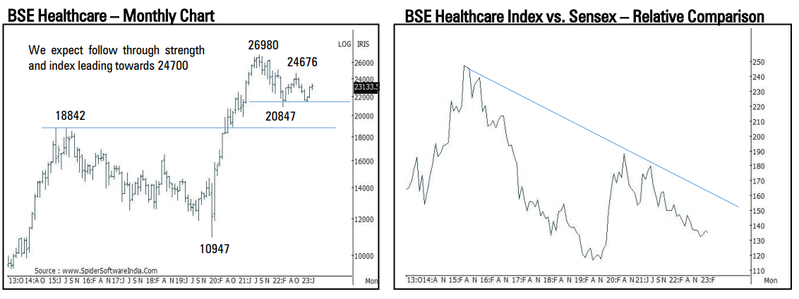 • In relative terms, the ratio  chart has given a breakout from eighteen months of declining channel indicating outperformance in coming months.