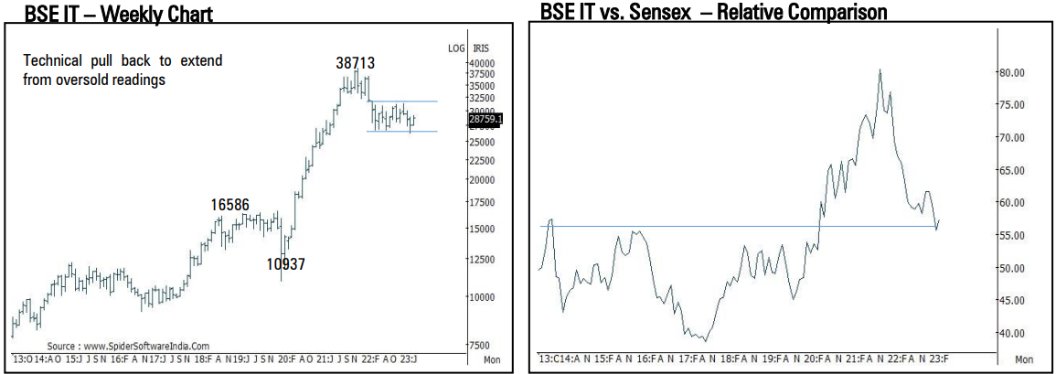 • The large cap IT stocks are witnessing pullback from key support, offering fresh entry opportunity with favourable risk reward set up. In our Relative strength model it is also placed at Bargain Buy quadrant.