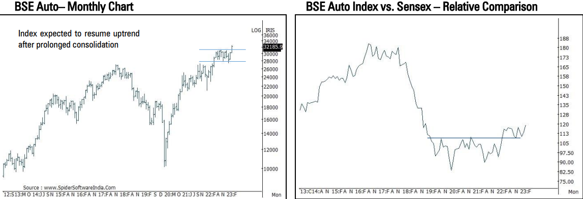 • The Auto Index has given a breakout from eight month consolidation amid broader participation from OEMs.