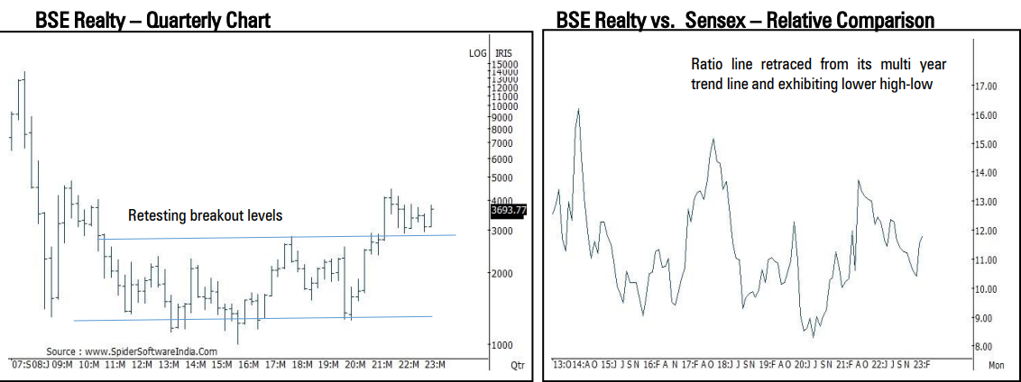 • The real estate sector is seen resuming uptrend after almost 19 months of underperformance. Signs of interest rates peaking out helped sector to stage sharp rally indicating resumption of uptrend.