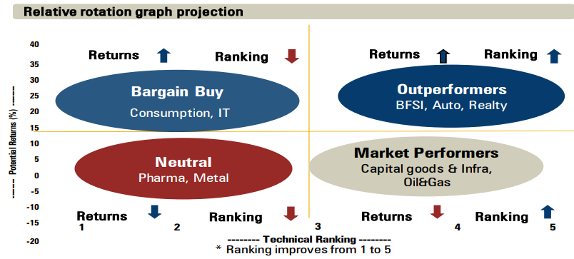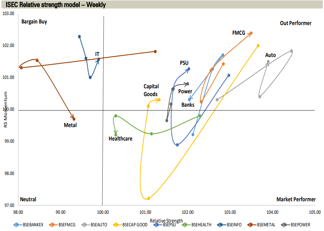 • FMCG index is placed at the outperformer quadrant (mainly lead by ITC). While other consumption stocks are seen resuming up move providing Bargain Buy opportunity.