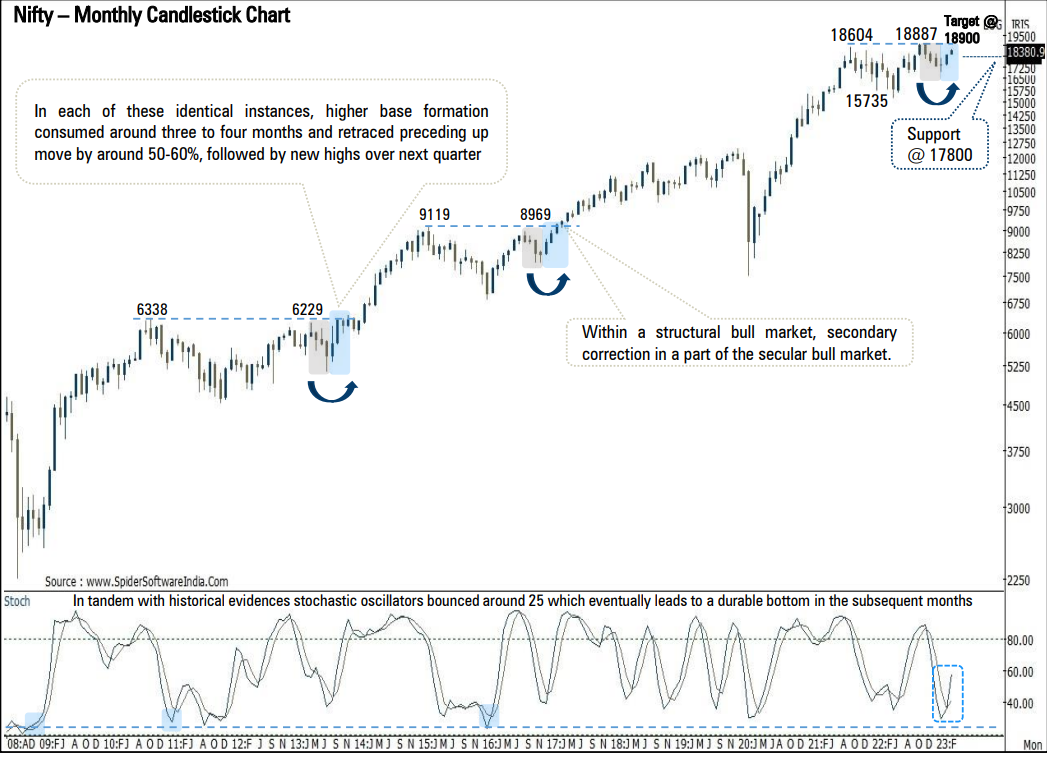 • We believe the current context is very similar to that of CY13, CY16 and CY18. In each of these identical instances, higher base formation consumed around three to four months and retraced preceding up move by around 50-60%, followed by new highs over next quarter (as shown in the adjoining chart).