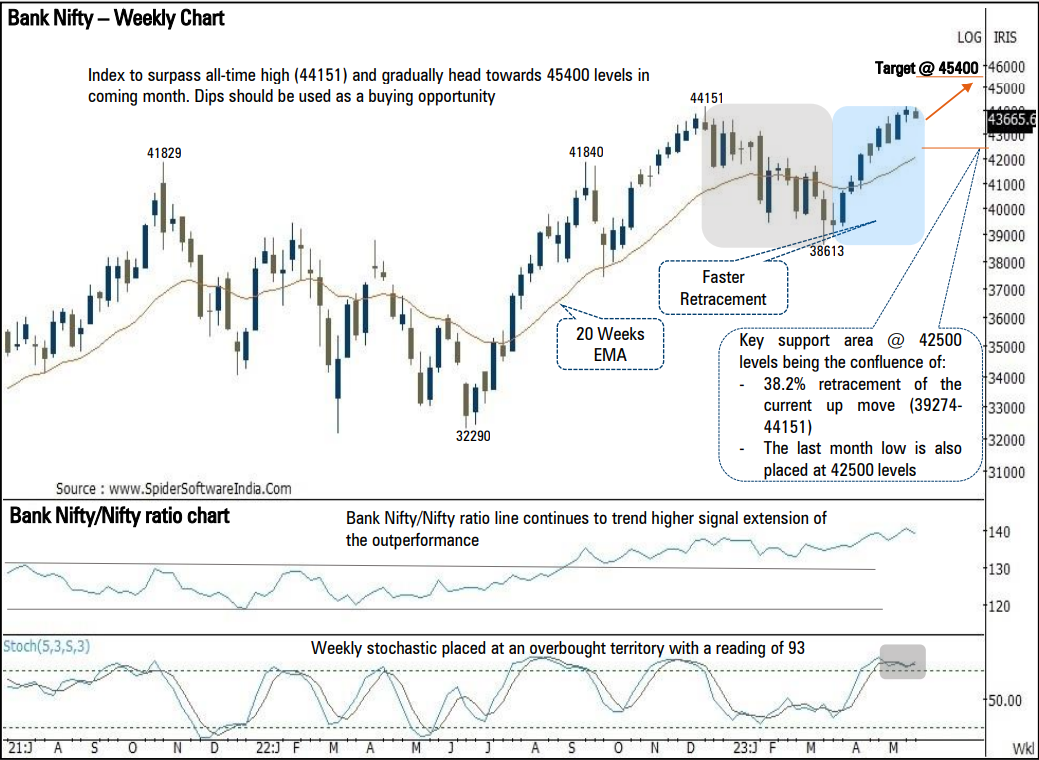 • Going ahead, we expect the index to surpass its all-time high (44,151) and gradually head towards 45,400 levels in a non-liner manner in the coming month as it is 123.6% extension of the entire December 2022-March 2023 decline (44,151-38,613). However, after the recent sharp up move of 15% in the just eight weeks the weekly stochastic are at an overbought territory with a reading of 93. Hence, a breather of couple of weeks in the broad range of 44,200-42,500 cannot be ruled out. It should not be seen as negative. Instead dips should be used as buying opportunity.