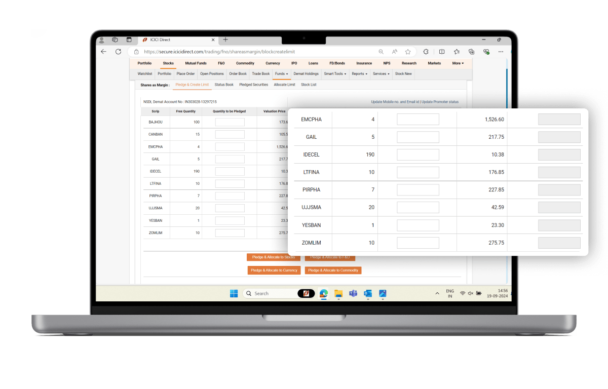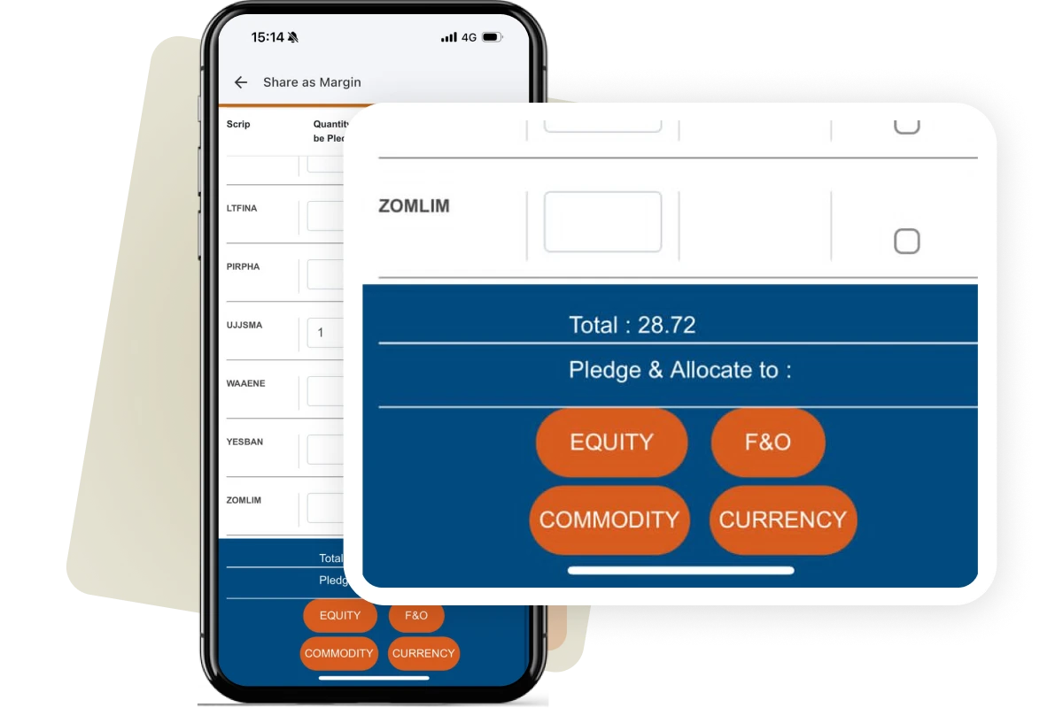 Shares As Margin (SAM) lets you pledge existing shares held in your Demat Holdings to create instant trading limits. These limits can be used to trade in Intraday, MTF, Commodities (only selling/writing) and other leveraged products.