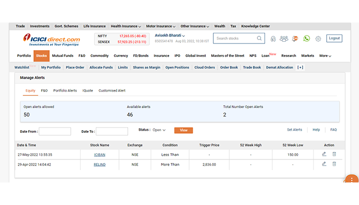 i-Alert feature is an automatic feature available for the web platform. There are series of customized alerts which can be set by customers by visiting “Manage Subscription” Section on the settings Icon. In order to avail of the Direct alert facility, you will have to login to the website www.icicidirect.com using your user ID and Password. On the Settings icon, Manage Alert Section will be available. On clicking the same, you can set the alert by filling up the necessary details.