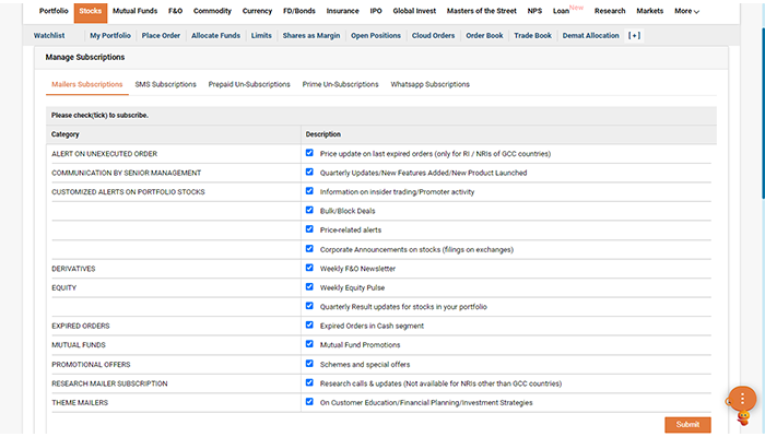 In case of Customized alert, you can modify the updates that you wish to receive, by ticking the description against the Category in Manage Subscription Section. It can be done for Mailer Subscription, SMS Subscription & What’s app subscription.