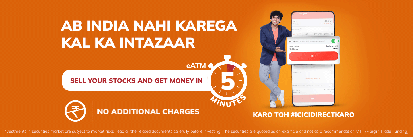 With ICICIdirect eATM you can receive 99% of the Sell value as instant payout within 5 mins of order execution at no extra cost. Normally if you sell shares from demat you will have to wait for T+ 1 working days to receive funds