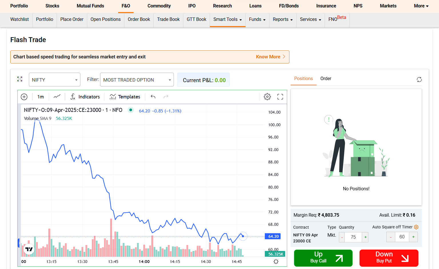Live chart trading (Flash Trade) is a fast and innovative tool which allows you to trade in Futures & Options with just a single click. You can track, trade and exit your trade in a single screen. Flash Trades offers a clutter free, single screen experience along with auto exit timers.