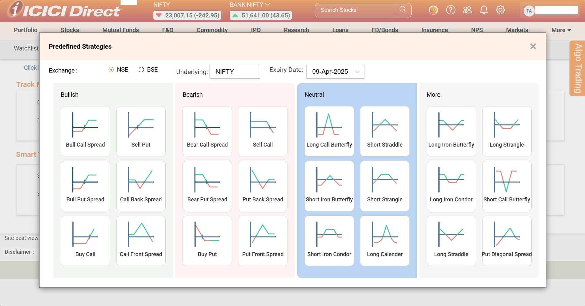 Pre-Defined strategies are frequently used ready-made strategy templates for quick execution in NSE. These are popular strategies and can be used for all available underlying Index or Stocks