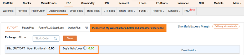 The Day’s Gain/Loss tab under F&O >> Open Positions helps you track the total profit or loss on your open Futures & Options positions for the current trading day. It includes unrealized gains or losses and is based on real-time price updates.
