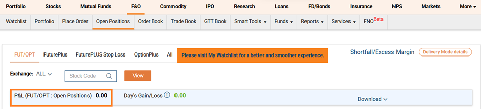 You can check the total Profit or Loss of your F&O Open Positions through the P&L (FUT/OPT) tab from the following path: F&O >> Open Positions.