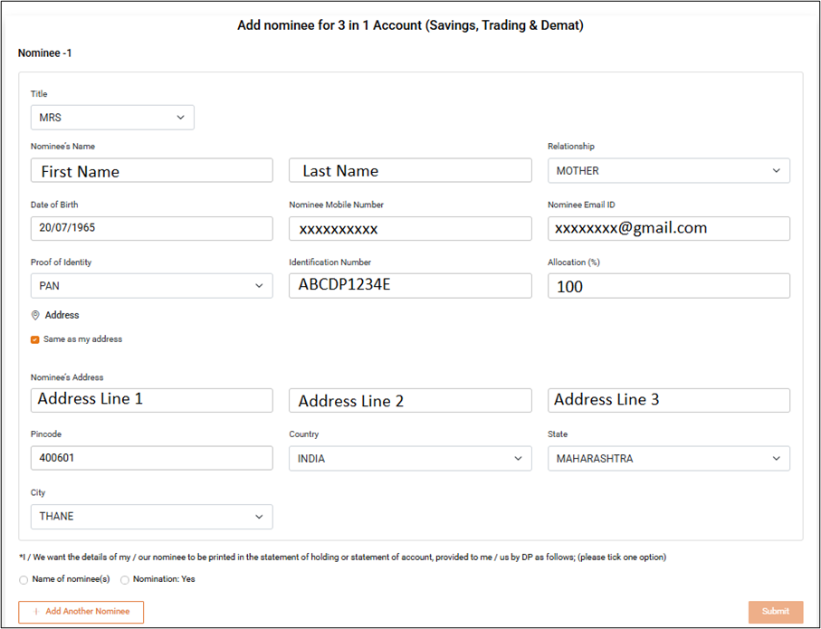 After submitting the nomination form, your nominee will be added automatically to your Trading and Demat account.