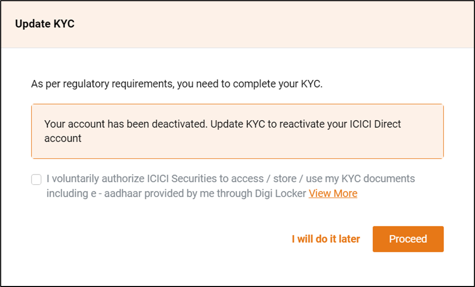 Alternatively, If you have not updated your 6 KYC attributes in the last 11 months, ICICI Direct will automatically show you a pop-up reminder upon login (on website or mobile app).