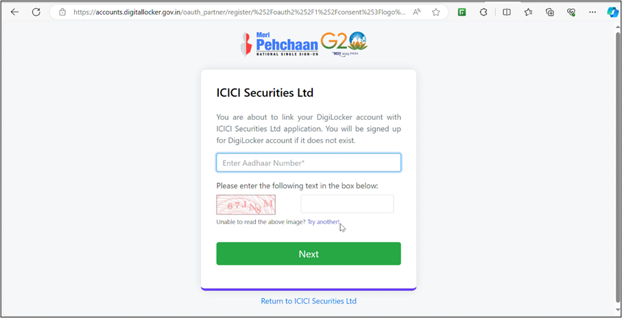 Customer will be redirected to Digilocker for fetching Aadhaar Card. Please enter Aadhaar Number, Captcha code and click on Next.