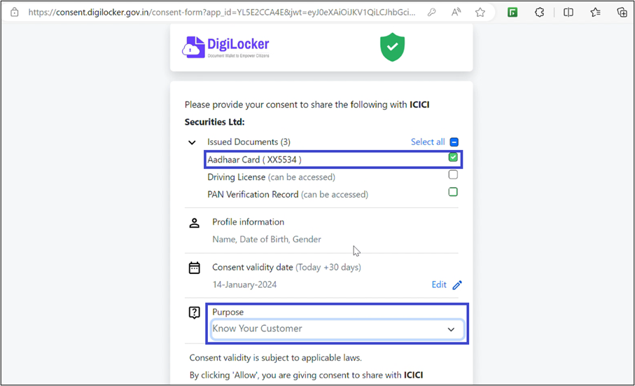 Click on box next to Aadhaar Card, select “Know Your Customer” in Purpose and Click on Allow.