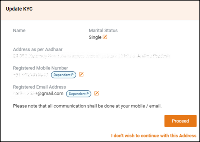 Your Address will be fetched from Aadhaar Card. Please confirm contact details and click on Proceed. Even if current and Aadhaar address is different, customer can still proceed with Aadhaar address as we send all communications on Mobile and Email.