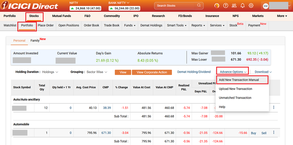 Path: Stocks → Portfolio → Advance Options → Add New Transaction Manual
