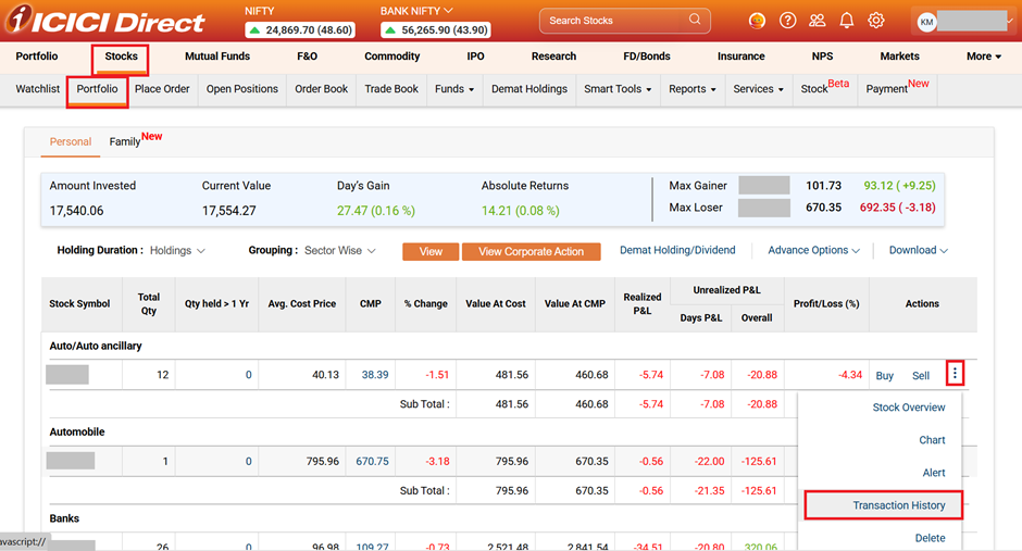 Path: Stocks → Portfolio → Click on 3 dots under ‘Actions’ for the stock → Transaction History → Add Transaction