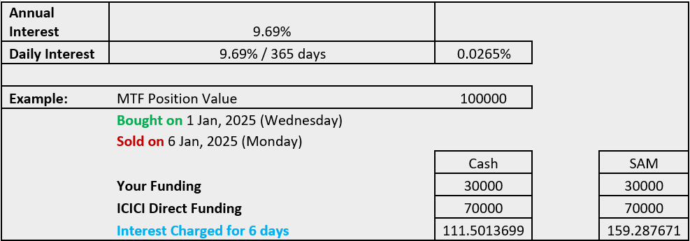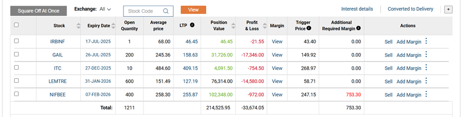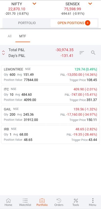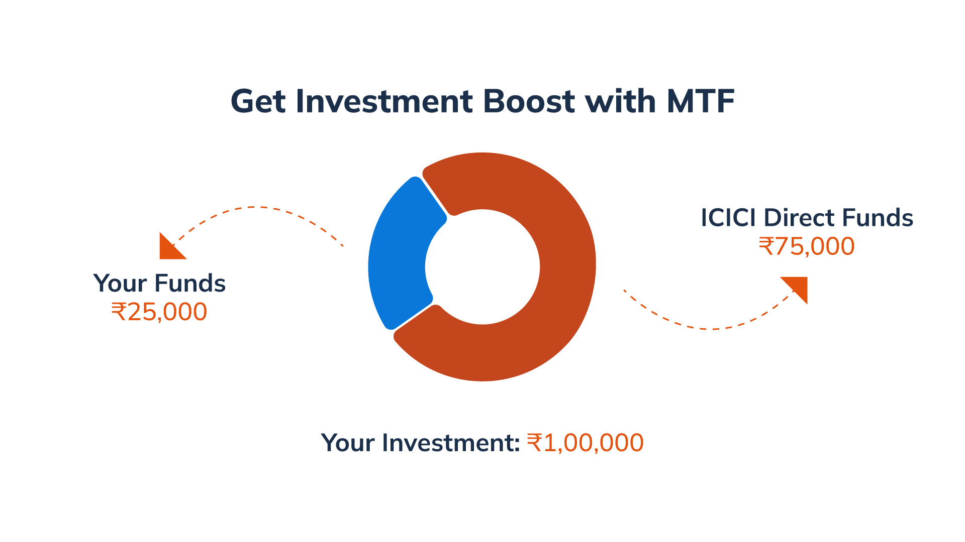 Let’s understand this with an example. Say you want to buy 1,000 shares of ABC Ltd. at ₹100 per share, but you have only ₹25,000 in your account, you can use MTF to increase your buying power to ₹1,00,000 with 4X leverage.