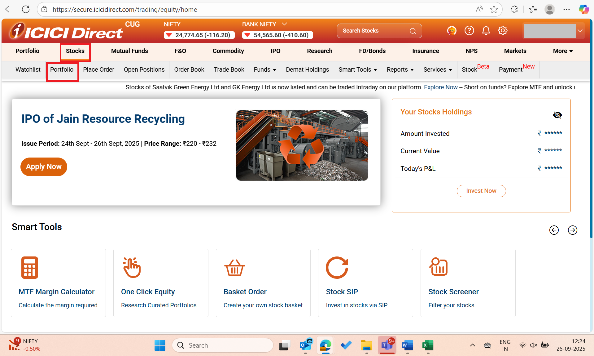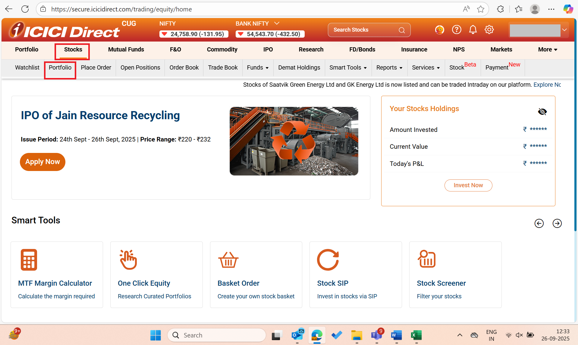 Visit ‘https://secure.icicidirect.com/trading/equity/home’ and click on Stocks