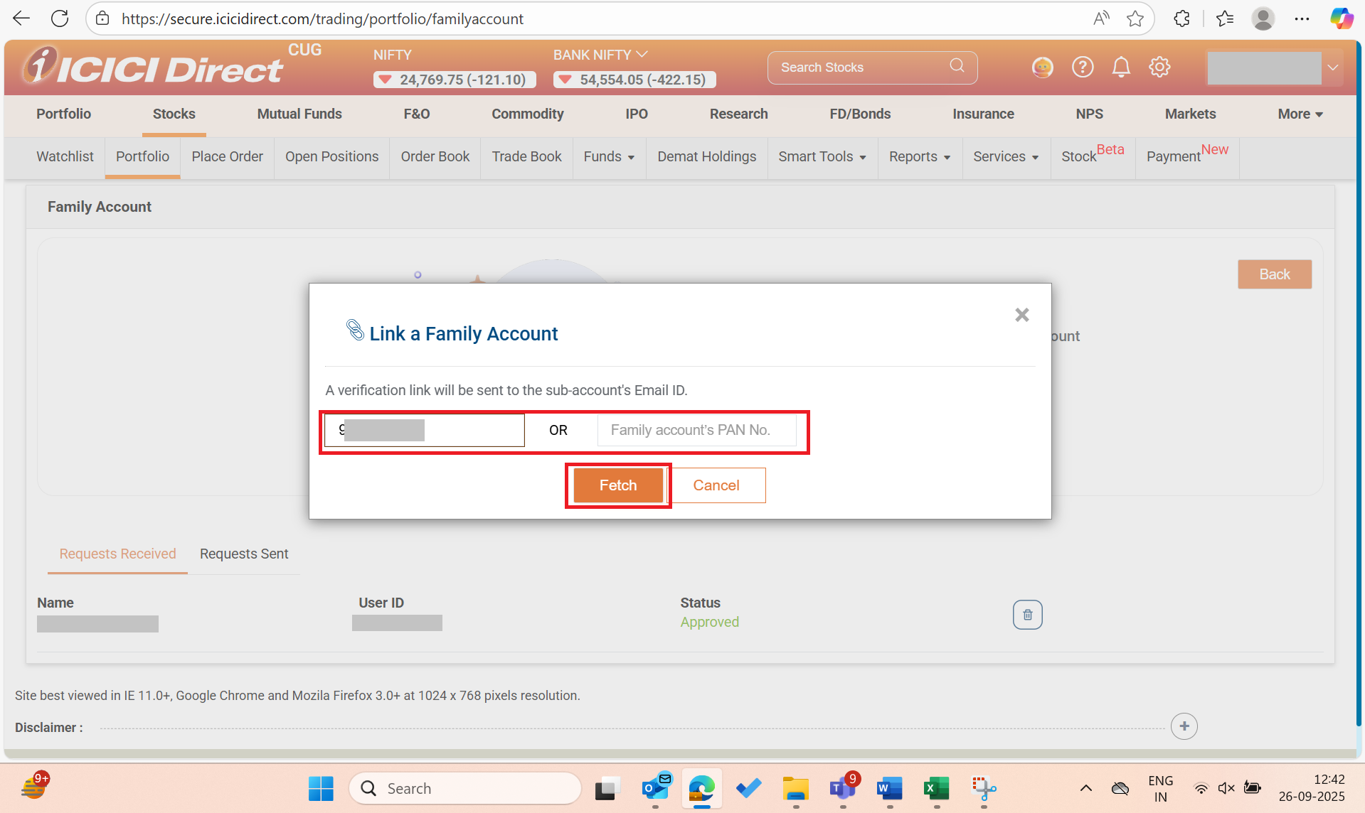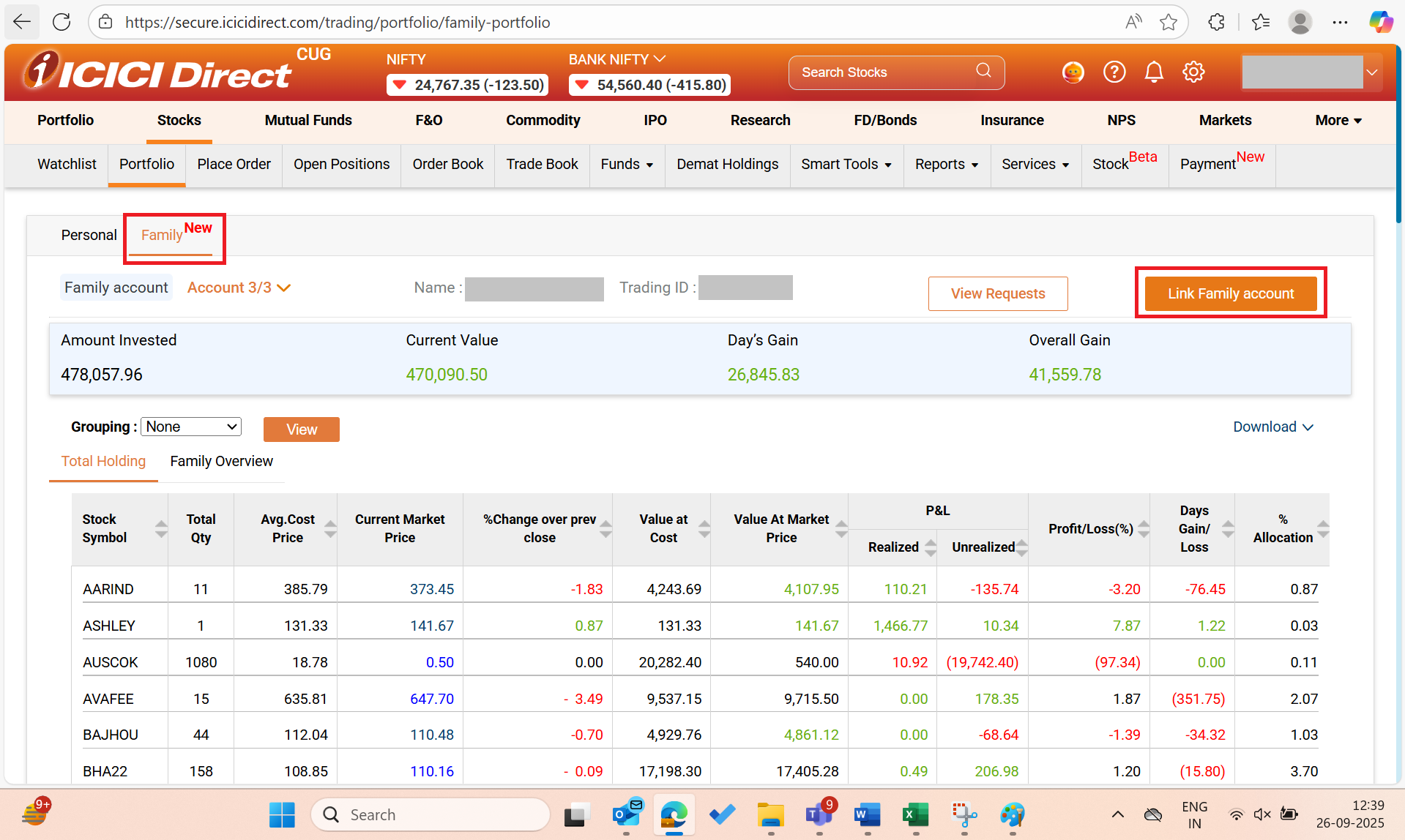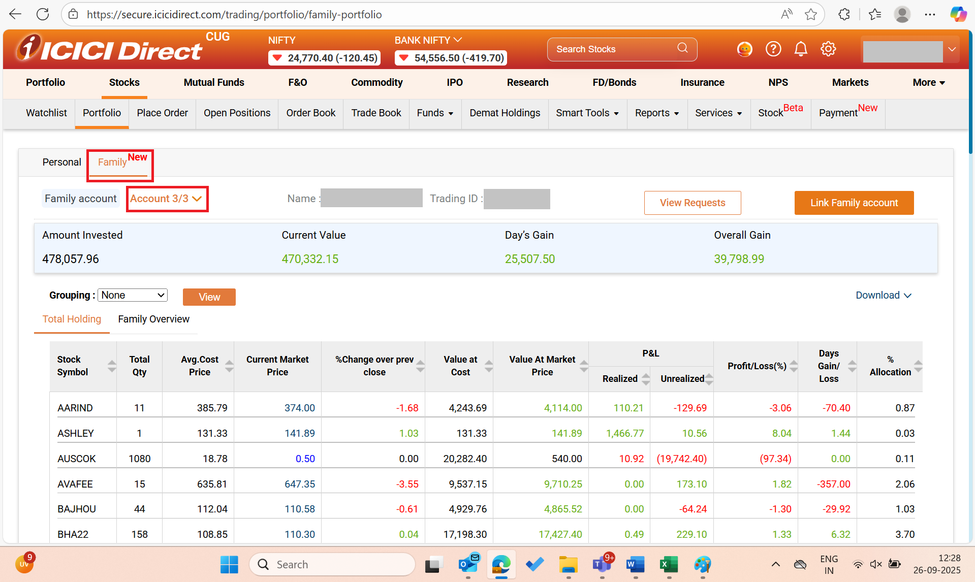 Login on ICICI Direct -> Stocks -> Portfolio -> Family