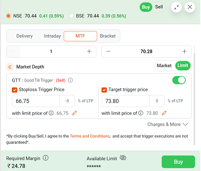 What is GTT? What is the validity of GTT order? Why did my GTT request get cancelled? Where can the active and triggered GTT request be tracked? Can I place GTT request for Cover/Square off against an Open position? What will happen to a pending GTT request if it doesn’t get triggered? Can I place GTT orders in MTF? How does the GTT feature work? Do I need to allocate funds for placing GTT request? How to place a buy/sell GTT order for stocks? What is Single trigger type in GTT? What is an OCO request in GTT? What is Trigger price & Limit price in a GTT request for stocks? Can I modify the trigger or limit price of a GTT request? Can I place only Target or only Stoploss request in GTT? What Happens to the Stoploss if the Target Price is Triggered and order is sent to the Exchange? What are the various statuses in GTT book against GTT request? Is the GTT option available for all the stocks? How to place a GTT buy or sell order for stocks using the mobile app? Can I place a GTT request for cover or square-off against an open MTF position? What are the maximum number of GTT orders that can be placed in Equity?