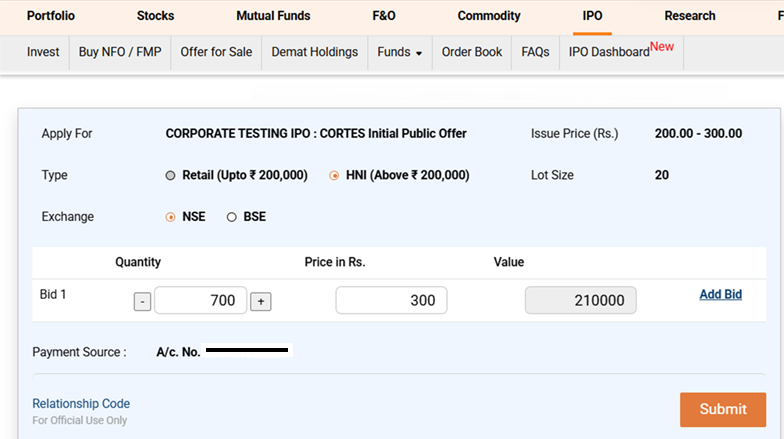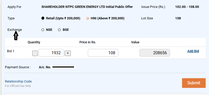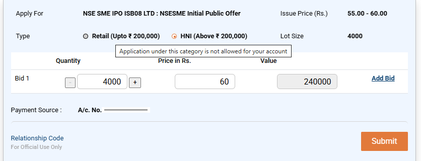 4. You can apply in either retail category (bid amount < 2lakhs) or HNI category (bid amount > 2 lakhs). Choose the category that align with your investment amount.