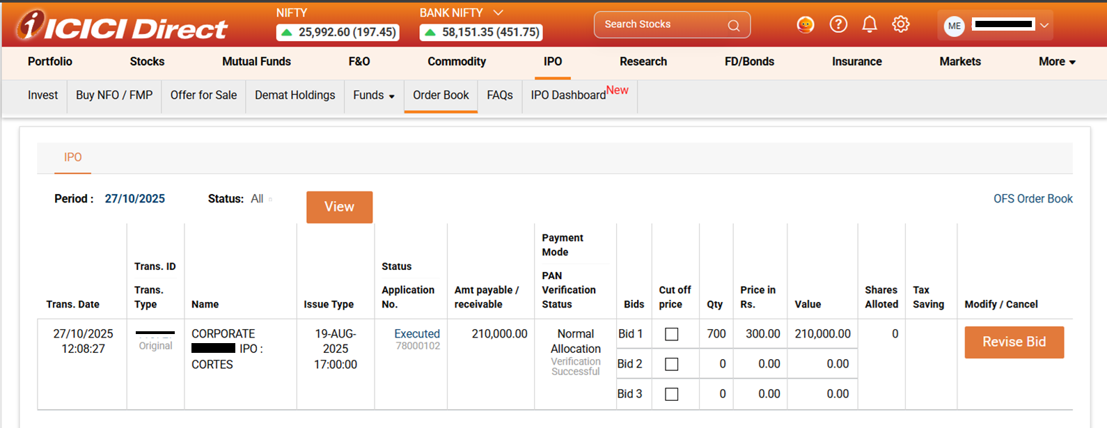 Step 1: Login to ICICI Direct Website and head to IPO Order book. Click on the ‘Revise Bid’ button.