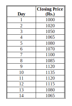 Assume we are analyzing RIL's daily price movements over a period of 14 days. Here's a simplified example of RIL's closing prices over the 14-day period: