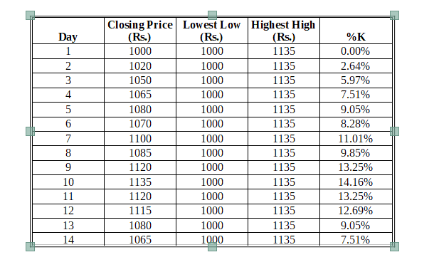 Now, let's calculate the Stochastic Oscillator values for RIL over this period: