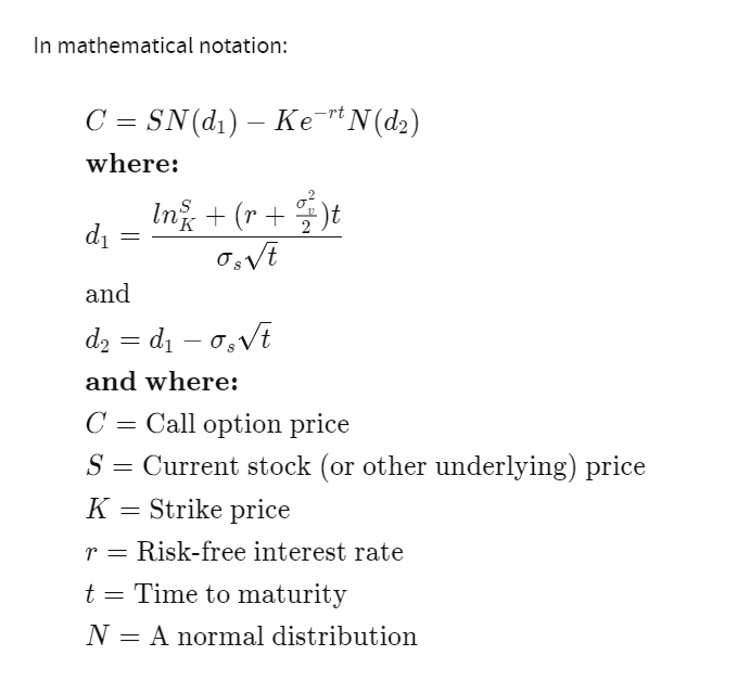 The Black-Scholes call option formula is calculated by multiplying the stock price by the cumulative standard normal probability distribution function. Thereafter, the net present value (NPV) of the strike price multiplied by the cumulative standard normal distribution is subtracted from the resulting value of the previous calculation.