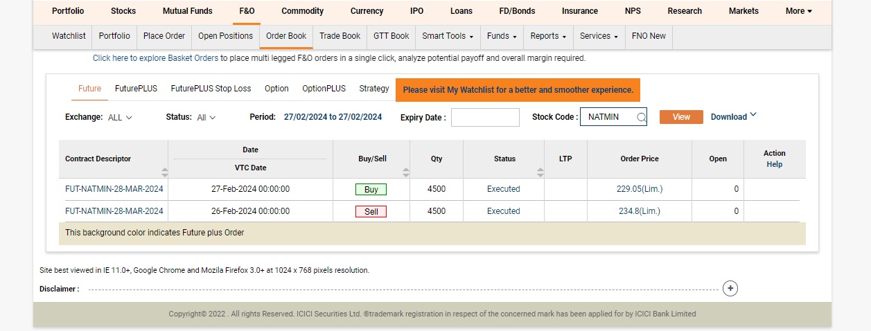 It is shown in order book in offline mode. The changes will reflect before the execution date, on your F&O open position as shown in example below: