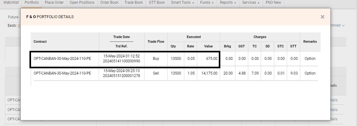 For Example - 550-PE, 540-PE, 520-PE strikes is valued at 110-PE, 108-PE, 104-PE respectively    as shown above in portfolio details.