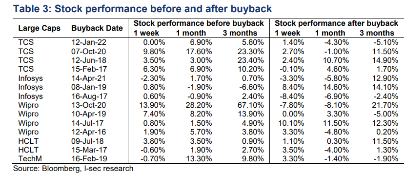 A key point to be noted is that during previous buybacks, Infosys shares climbed by 12-21% from the announcement to the buyback's closure and outperformed Nifty IT on 2 of the past 3 occasions. Also, Infosys stock price had even reached the maximum buyback price during the previous two buybacks.