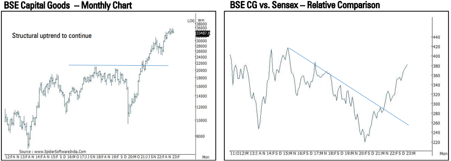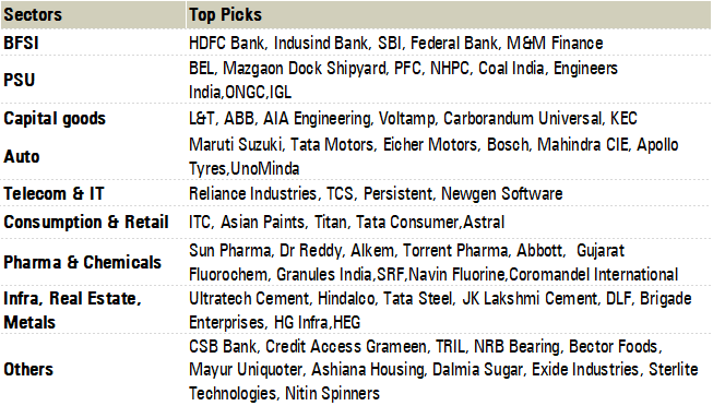 • Sectoral participation broadening: What stands out in the current rally is that, apart from outperforming sectors like BFSI and capital goods, laggards of past 18 months like pharma, chemicals, realty have also participated. We believe sectoral participation broadening is a sign of a more sustainable rally ahead.
