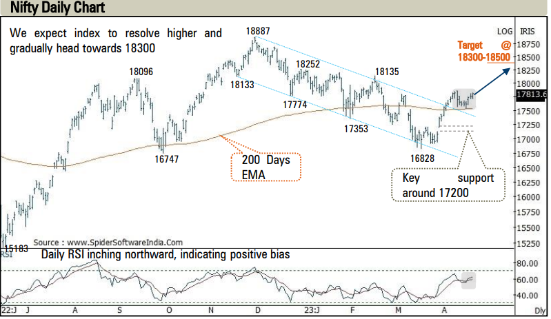 • We expect the index to continue its ongoing upward momentum and gradually head towards next milestone of 18,300-18,500 as it is high of January 2023 coincided with 80% retracement of Dec-Mar decline (18,887-16,828). Thus, dips should be capitalised on to accumulate quality stocks.