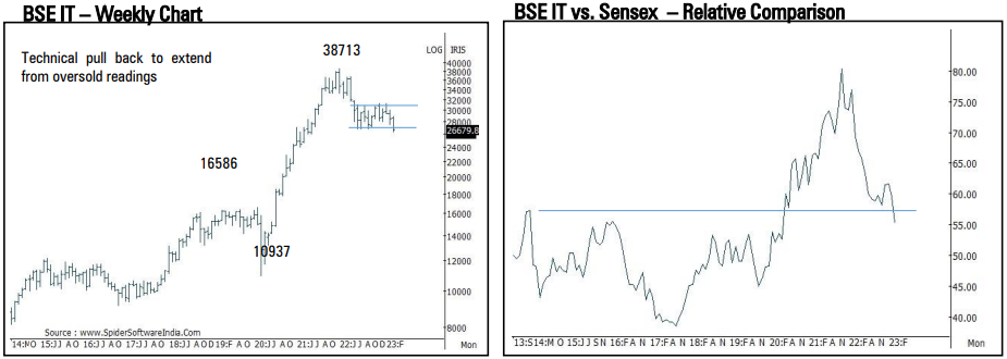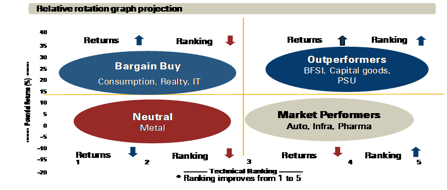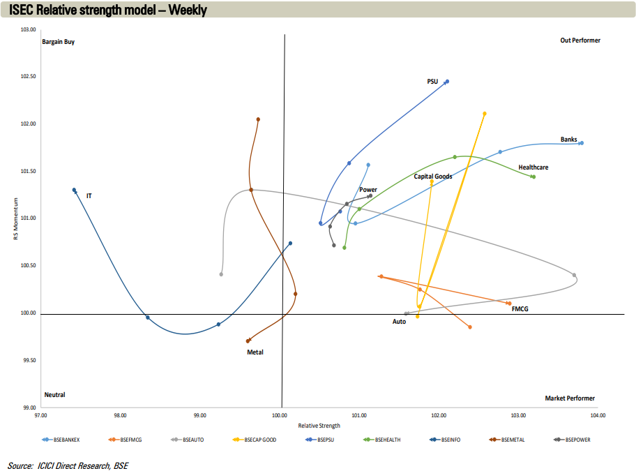 • IT stocks, after the recent sharp correction, are placed at key support, offering a fresh entry opportunity with favourable risk reward set up. In our Relative strength model, it is also placed at Bargain Buy quadrant.