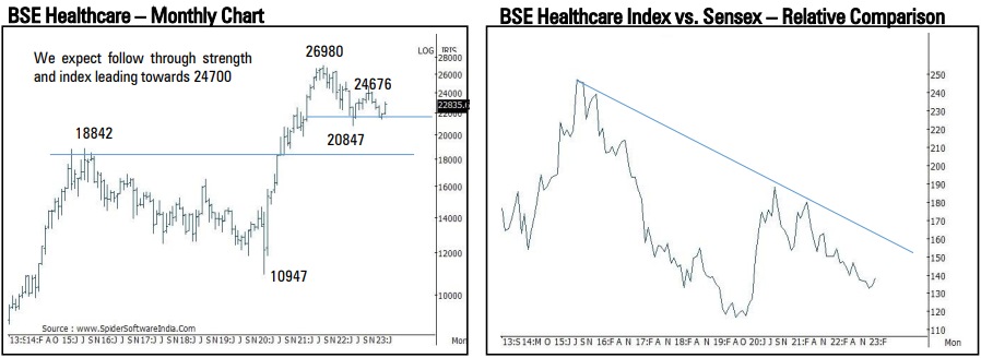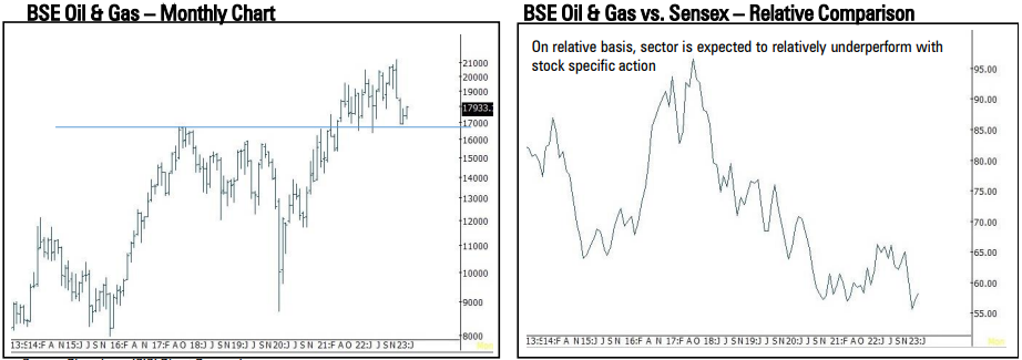 • In relative terms, the index ratio with benchmark is poised at a key hurdle and indicates relative underperformance with stock specific performances. Many stocks in the sector are oversold and a technical pullback is likely.