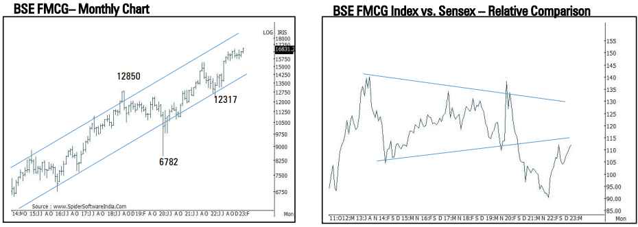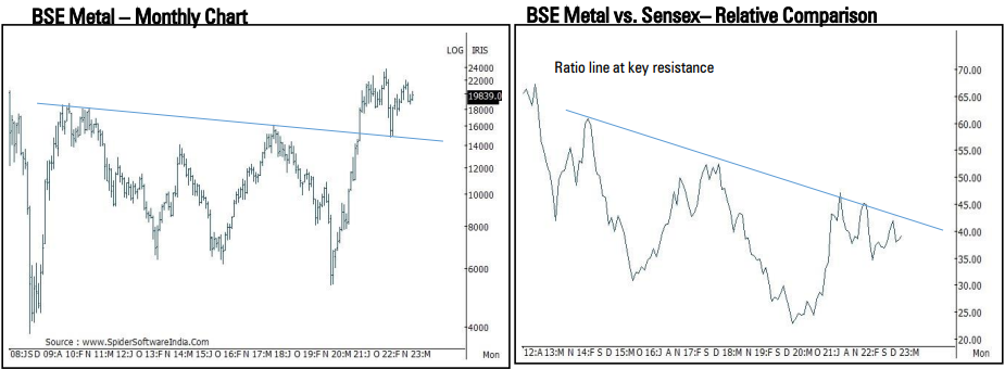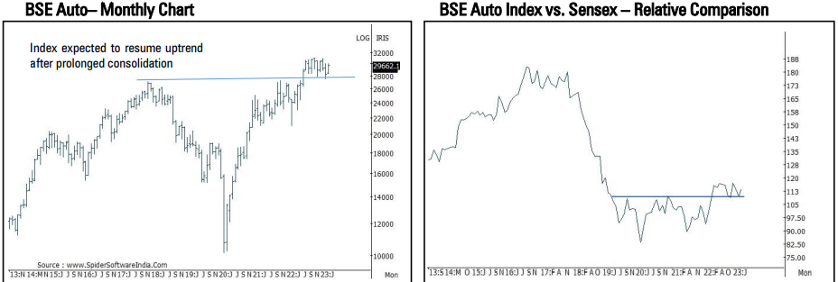 • In relative terms, ratio line is consolidating post breakout from multi year base formation. We expect sector to perform in line with benchmarks and provide favourable risk-reward.