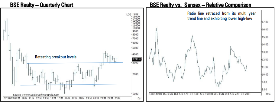 • In relative terms, the ratio is in downtrend. We expect the realty sector to gain upward momentum in a gradual manner. Infra stocks, on the other hand are expected to relatively perform better.
