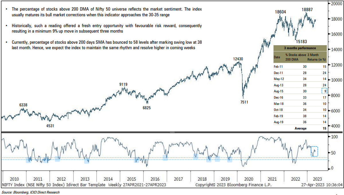 • Our bottom up model supported by market internals suggests further legs in the ongoing rally. We expect the Nifty to gradually head towards 18,300-18,500 in May 2023 in a non-linear fashion with strong support at 17,200. Stick to a buy on dips approach with focus on midcaps amid progression of Q4 earnings.