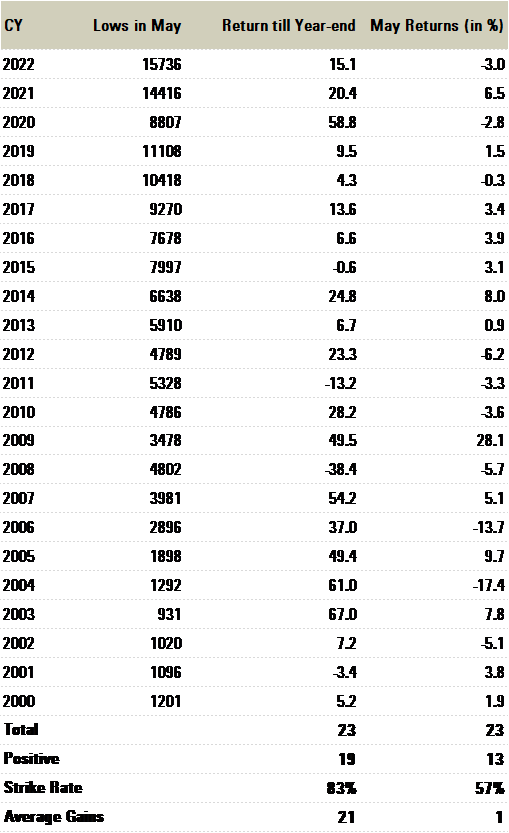 The adjacent table lists, May lows every year for the Nifty and year-end returns as calculated from May lows.