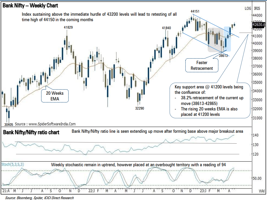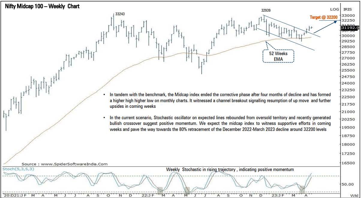 • The Bank Nifty gained for a second consecutive month and continued to outperform the Nifty. The index, in the process, retraced almost 80% of entire December 2022-March 2023 decline (44,151-38,613). It witnessed a sharp up move of 9% in just four weeks, which led to weekly stochastic approaching overbought territory with a reading of 94. Hence, a couple of weeks of breather cannot be ruled out, which should not be seen as negative. Instead, it will make overall trend healthy.