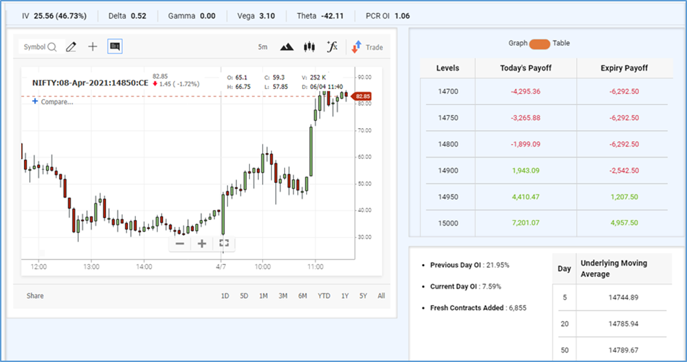 Live Chart, Greek Values, Moving Averages can all be viewed