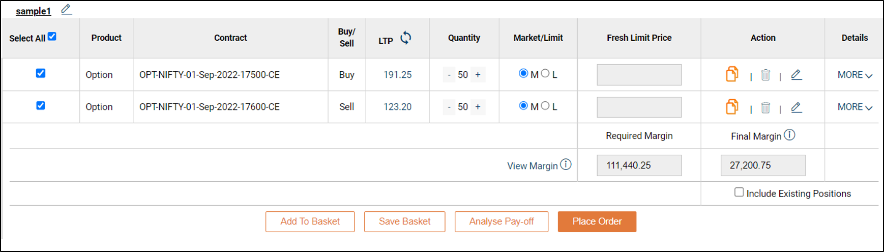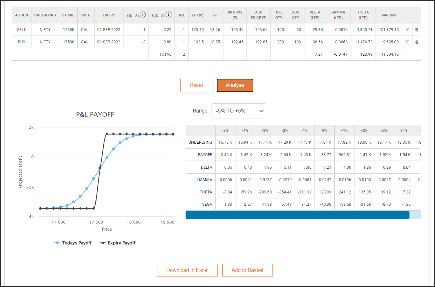 With the help of strategy builder, you can design your own multi-leg strategies directly from option chain & then analyze using pay-off tables and charts as well as detailed Greek analysis at strategy level.