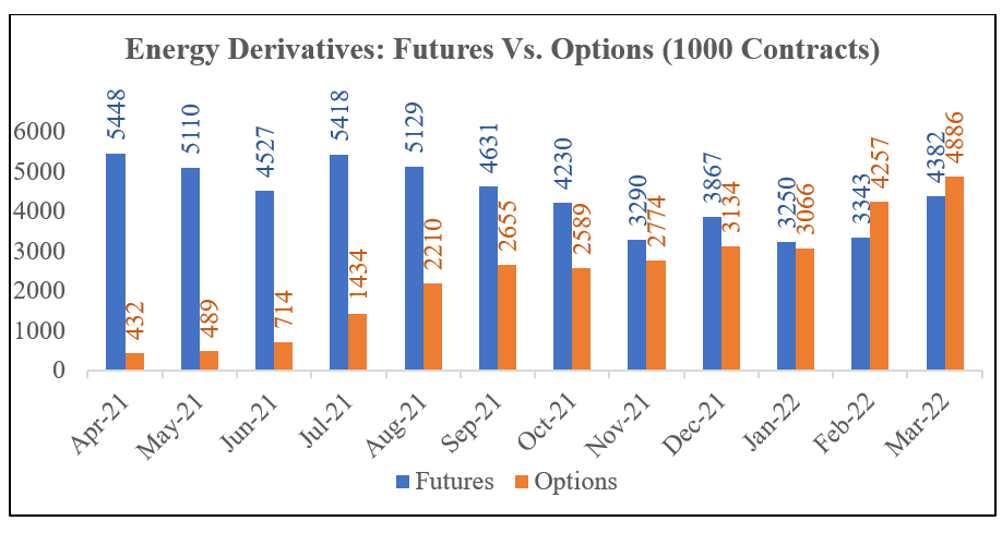 भारत में राष्ट्रीयकृत कमोडिटी एक्सचेंजों की स्थापना 2003 में होने के बाद से ही कच्चे तेल और प्राकृतिक गैस के वायदा सौदे कमोडिटी सूची में शामिल हैं। कच्चे तेल के वायदा सौदे 2018 में और प्राकृतिक गैस के वायदा सौदे जनवरी 2022 में शुरू किए गए थे। पिछले कुछ वर्षों में निवेशकों के बीच ऊर्जा विकल्पों की लोकप्रियता बढ़ी है, और वित्त वर्ष 2021-22 में, ऊर्जा विकल्पों की संख्या अप्रैल 2021 के मात्र 432 हजार अनुबंधों से बढ़कर मार्च 2022 में 4886 हजार अनुबंधों तक पहुंच गई है। निम्नलिखित चार्ट ऊर्जा वायदा और विकल्पों में महीने-दर-महीने वृद्धि को दर्शाता है। जनवरी 2022 में प्राकृतिक गैस पर ऑप्शंस की शुरुआत के बाद, फरवरी 2022 से ऑप्शंस वॉल्यूम ने फ्यूचर्स कॉन्ट्रैक्ट वॉल्यूम को पीछे छोड़ दिया और यह वृद्धि जारी है।