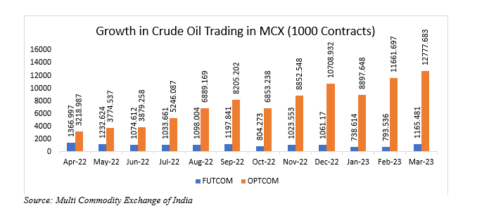 Over the period, crude oil options are gaining popularity amongst the investors and in the fiscal 2022-23, crude oil options are superseding the futures contracts. Following chart depicts month on month growth in the crude oil futures and options. Since beginning of April 2022, crude oil options volumes are much higher than futures volume and in March 2023, options turnover was 10 times more than futures turnover.